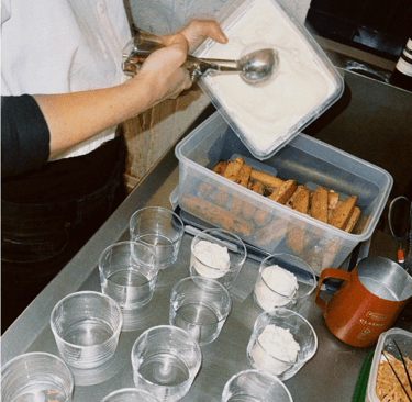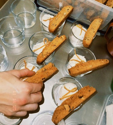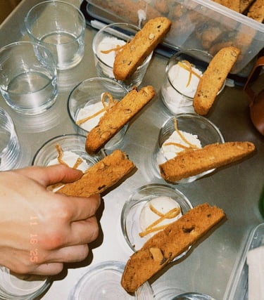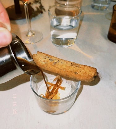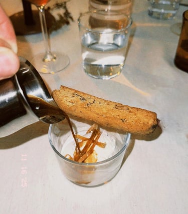 Para finalizar, Delia presentó su postre: affogato con helado artesanal de nata y especias otoñales, acompañado de un biscotti de almendras y unas cascaritas de naranja confitadas, una combinación pensada para equilibrar texturas y sabores. Todo acompañado del riquísimo café de especialidad de Apurado Café.